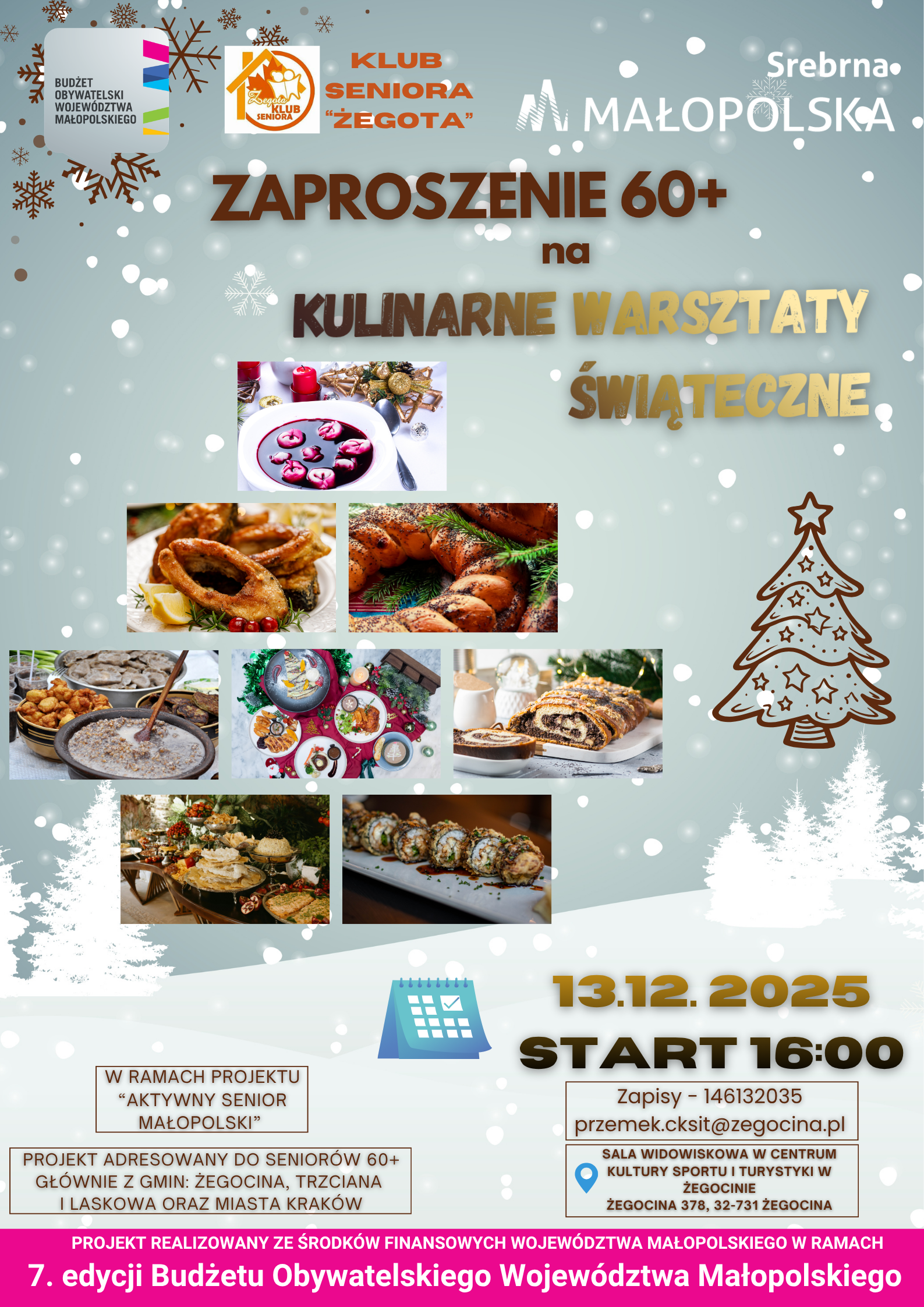 Klub Seniora „Żegota” serdecznie zaprasza Seniorów 60+ na wyjątkowe kulinarne warsztaty świąteczne, podczas których wspólnie przygotujemy tradycyjne potrawy i poczujemy magię nadchodzących Świąt Bożego Narodzenia.