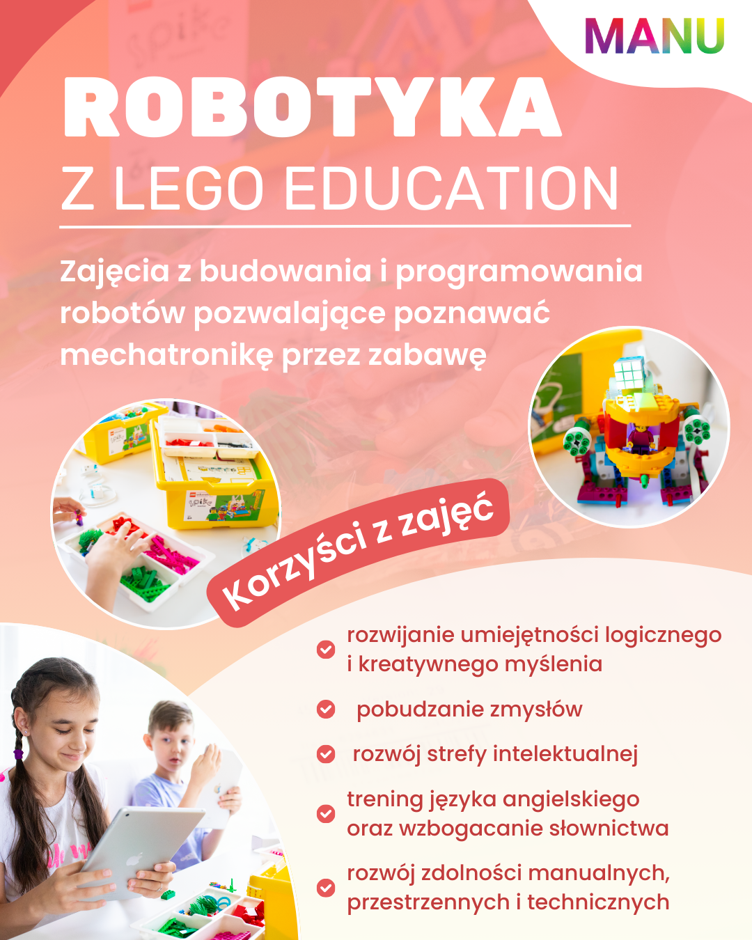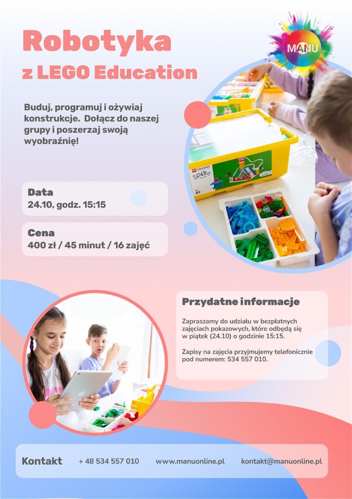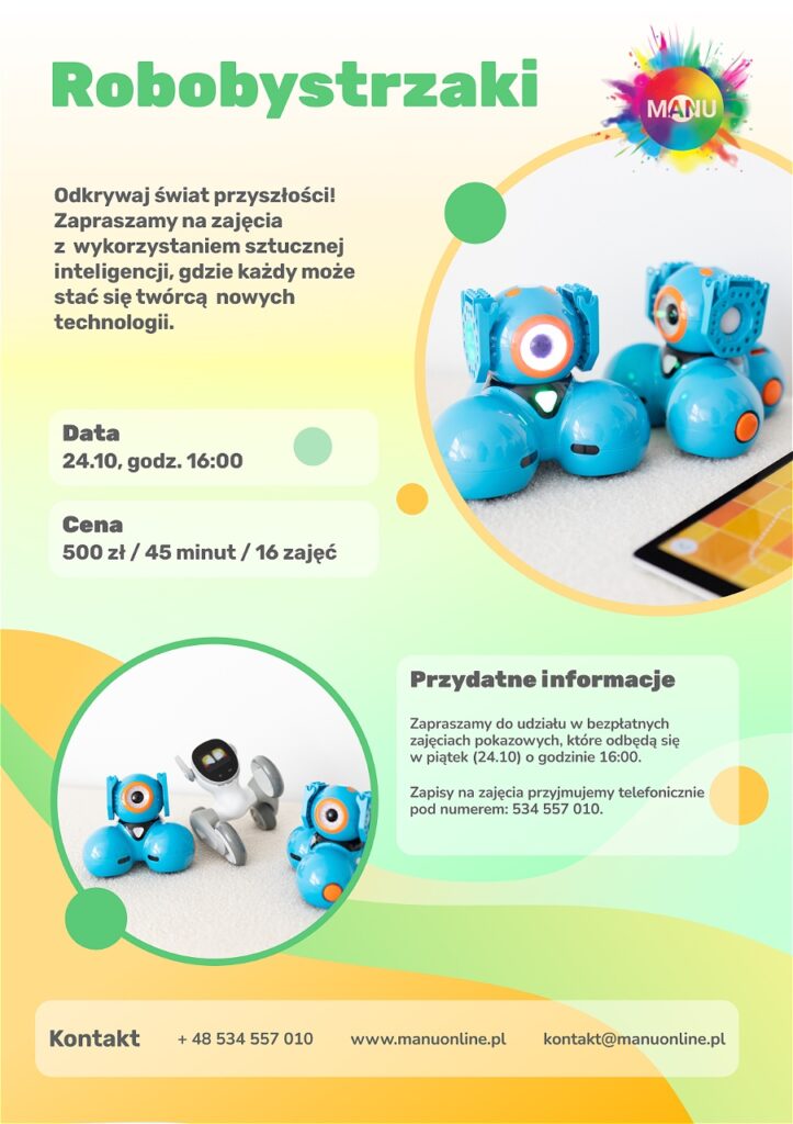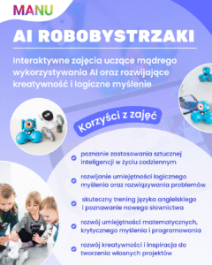 firma MANU od kilku lat tworzy i prowadzi innowacyjne kursy edukacyjne w przedszkolach i szkołach na terenie Małopolski. Nasza kadra to zespół pasjonatów, którzy z radością przekazują dzieciom wiedzę z zakresu robotyki, programowania i sztucznej inteligencji