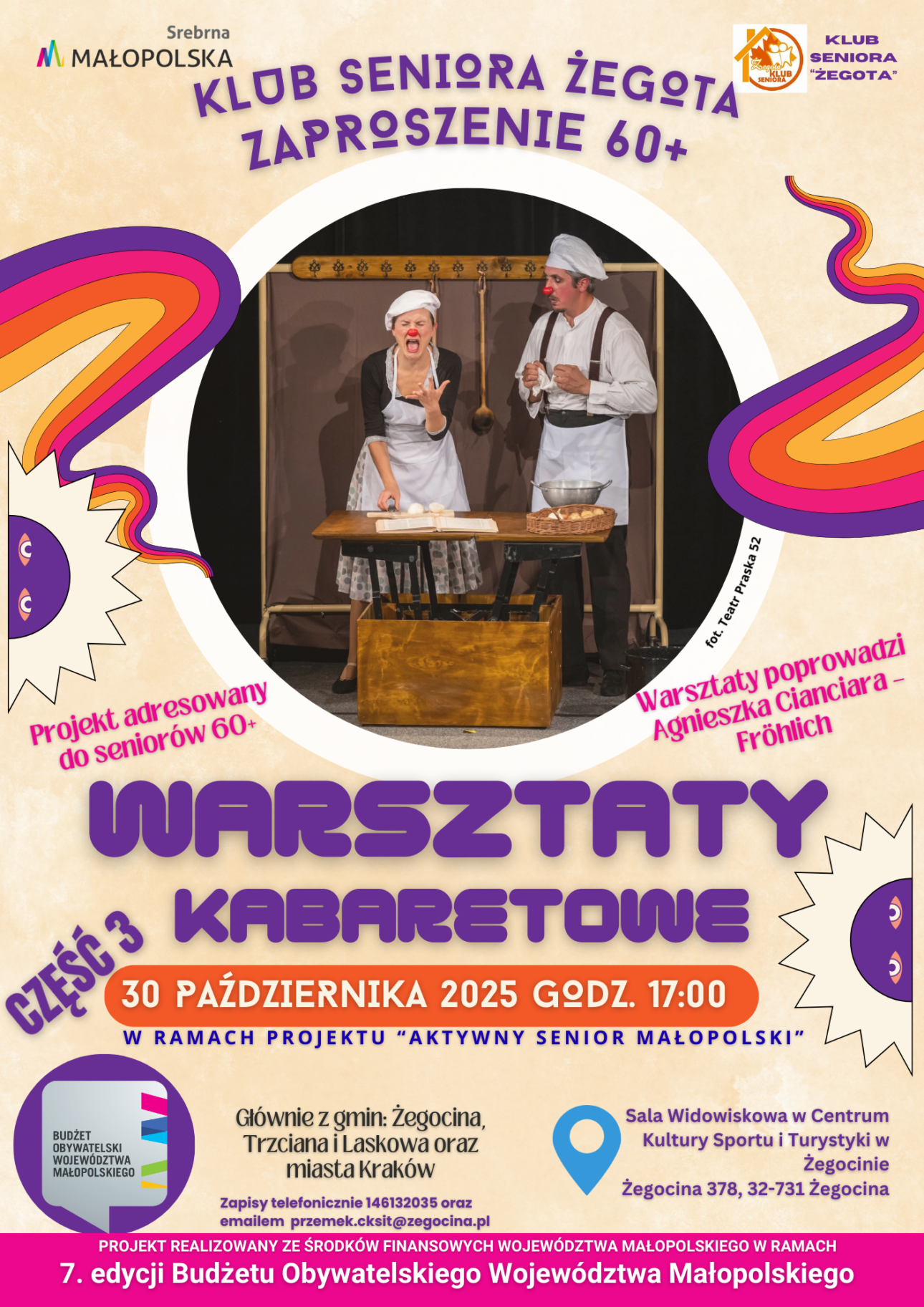 UWAGA SENIORZY 60+! Już wkrótce w Żegocinie czeka na Was wydarzenie pełne uśmiechu, zabawy i artystycznej energii! 16 października 2025 (czwartek) godz. 17:00 Sala Widowiskowa w Centrum Kultury, Sportu i Turystyki w Żegocinie Warsztaty Kabaretowe VOL. 2 dla wszystkich Seniorów 60+ z gmin: Żegocina, Trzciana, Laskowa oraz miasta Kraków! Zajęcia poprowadzi wyjątkowa Agnieszka Cianciara–Fröhlich,