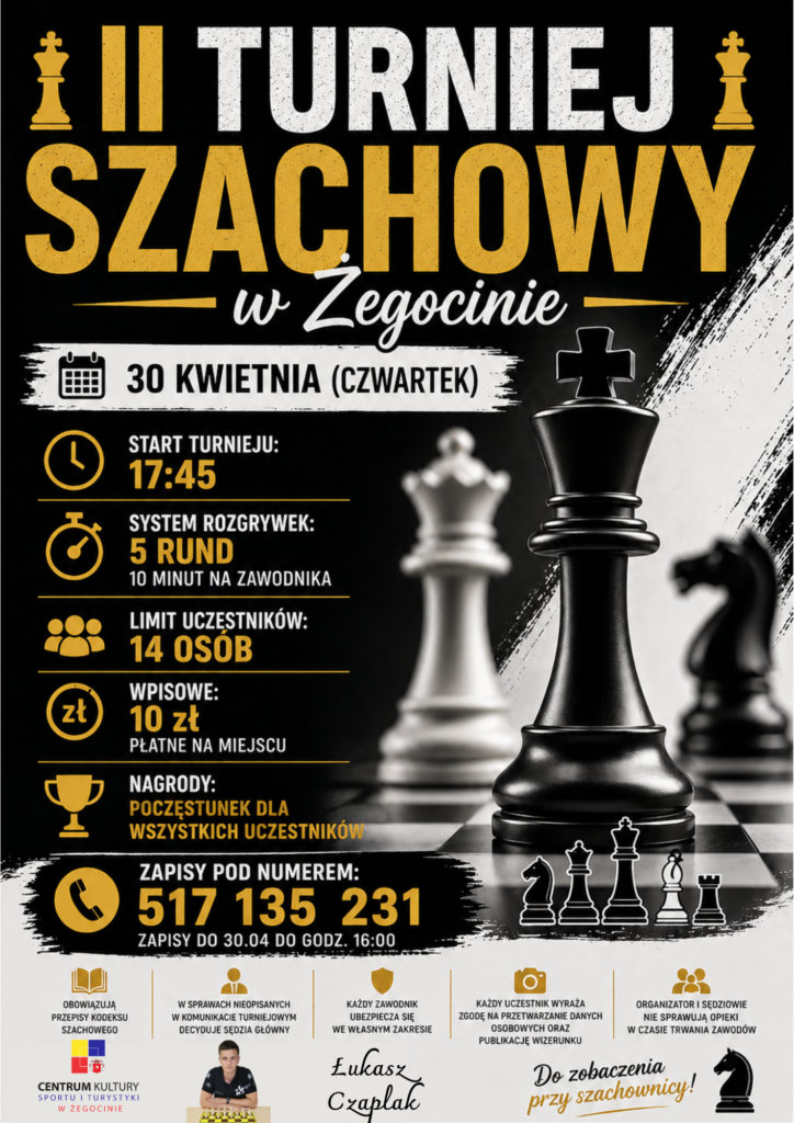 Centrum Kultury, Sportu i Turystyki w Żegocinie zaprasza wszystkich miłośników królewskiej gry na Turniej Szachowy, który odbędzie się: