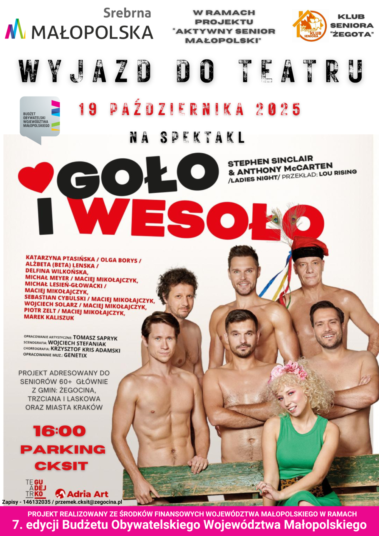 🎭😄 Kochani Seniorzy 60+! 😄🎭 Zapraszamy Was serdecznie na wyjazd do teatru na kultowy, pełen humoru spektakl„Goło i Wesoło”! 🌟 📅 Data: 19 października 2025 r.👥 Dla kogo: Seniorzy 60+ To doskonała okazja, by spędzić czas w świetnym towarzystwie, pośmiać się do łez i oderwać od codziennych obowiązków. Spektakl gwarantuje mnóstwo pozytywnej energii, błyskotliwy humor