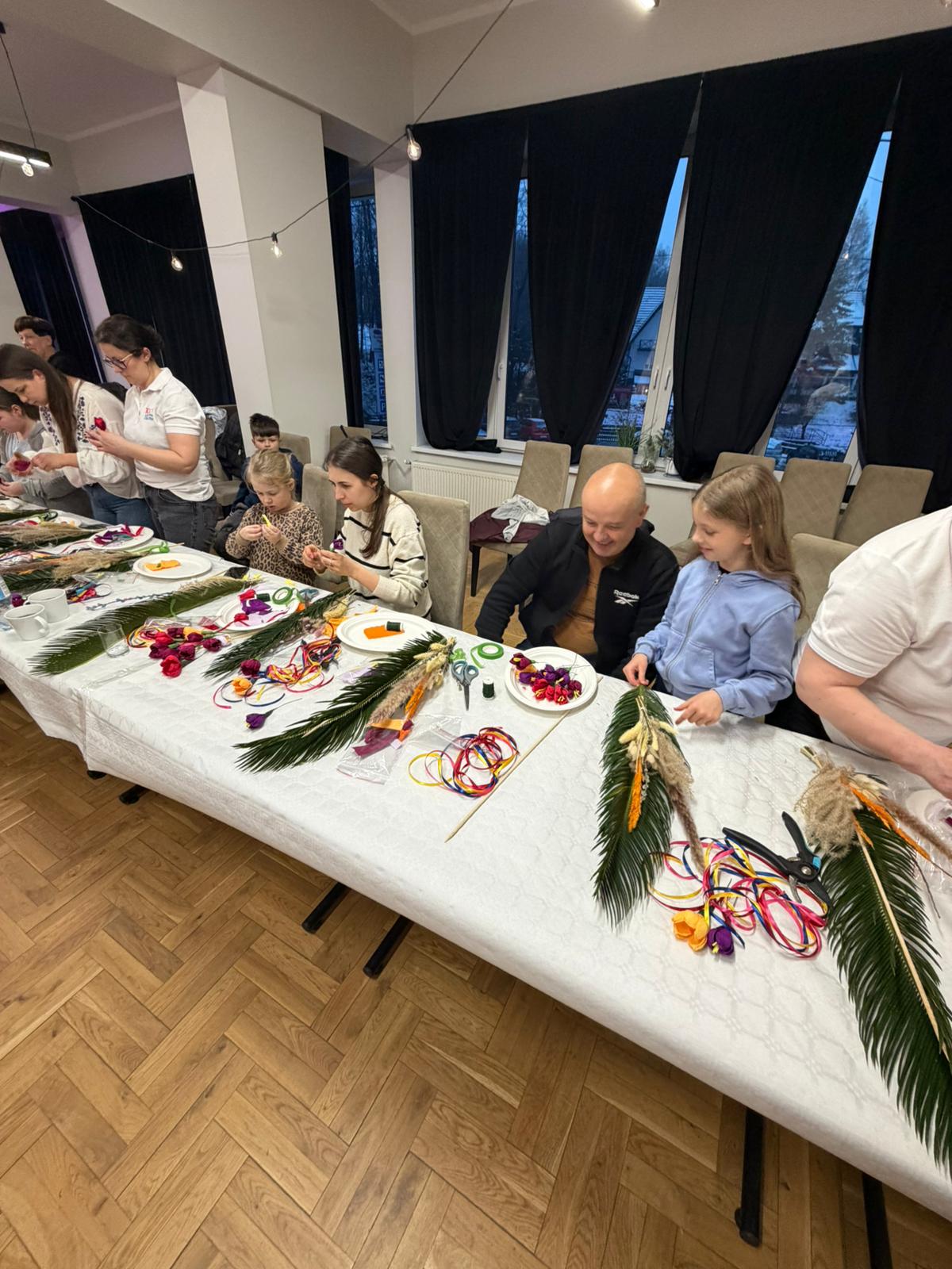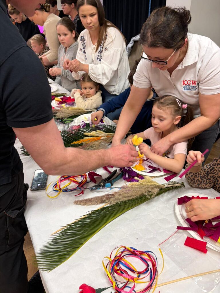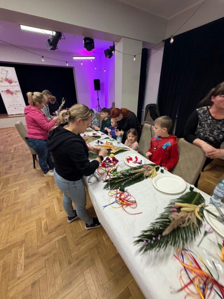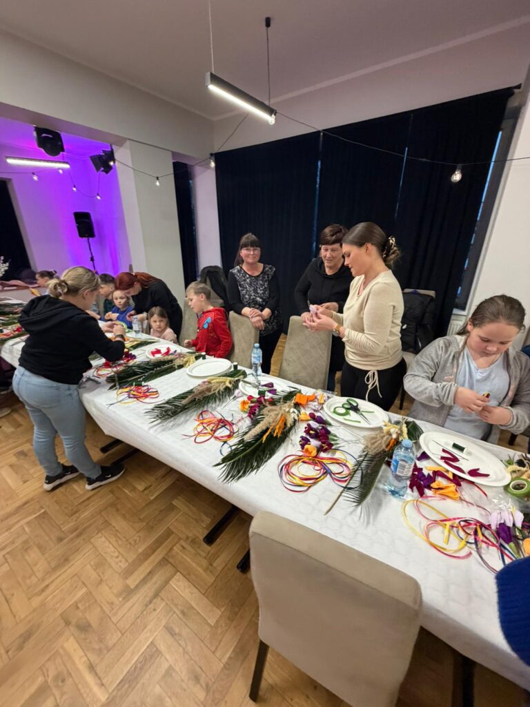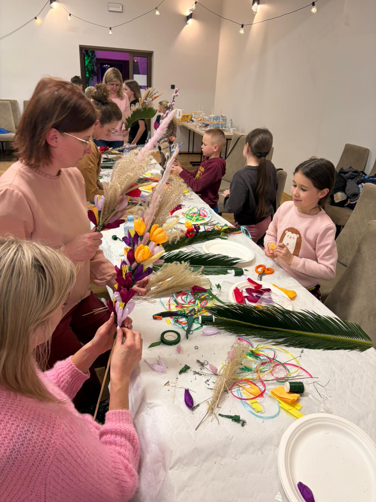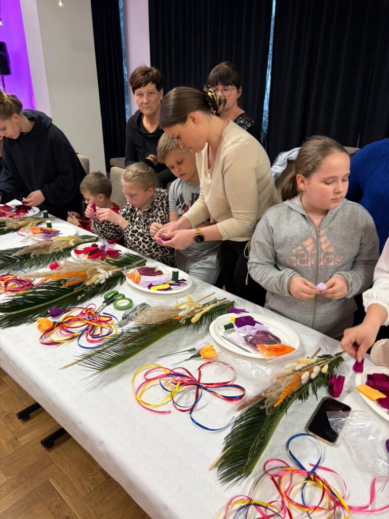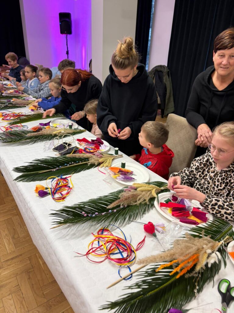W zajęciach uczestniczyły dzieci wraz z opiekunami z terenu gminy, którzy z entuzjazmem włączyli się w twórcze działania. Dzięki wsparciu instruktorów z Pracowni Florystycznej MP Magdalena Płoskonka uczestnicy mieli okazję poznać różnorodne techniki tworzenia palm oraz samodzielnie wykonać barwne kompozycje z wykorzystaniem tradycyjnych i dekoracyjnych materiałów.