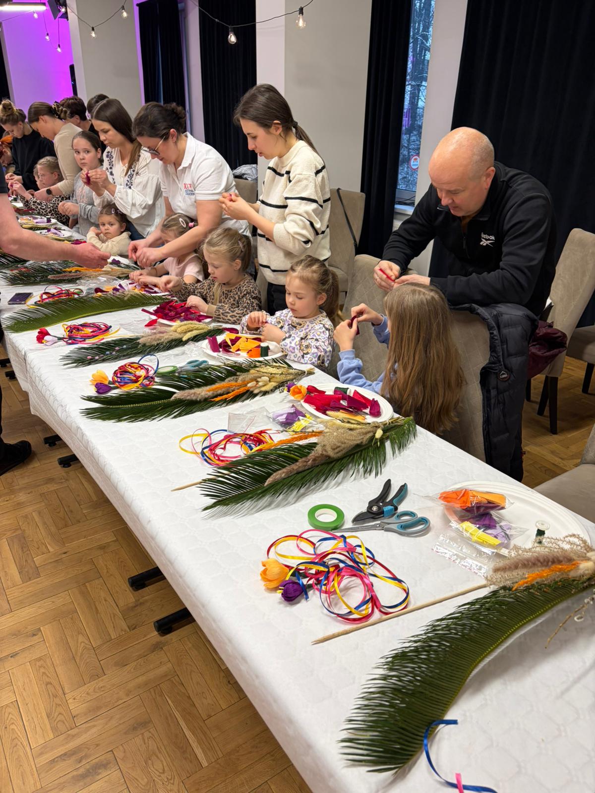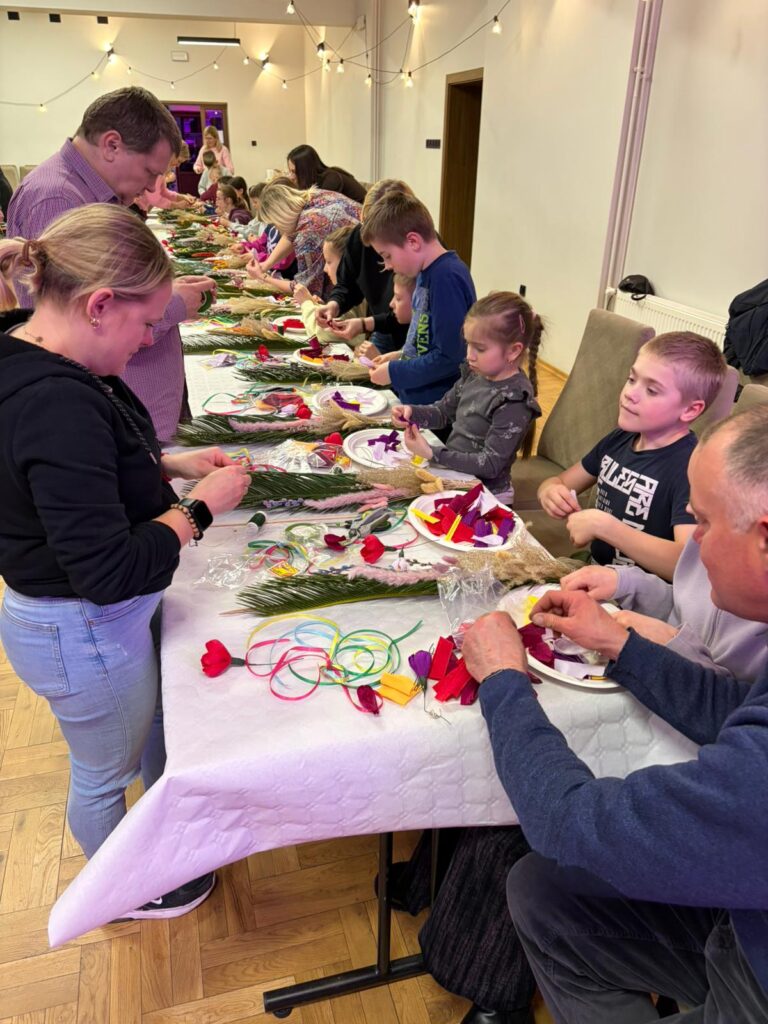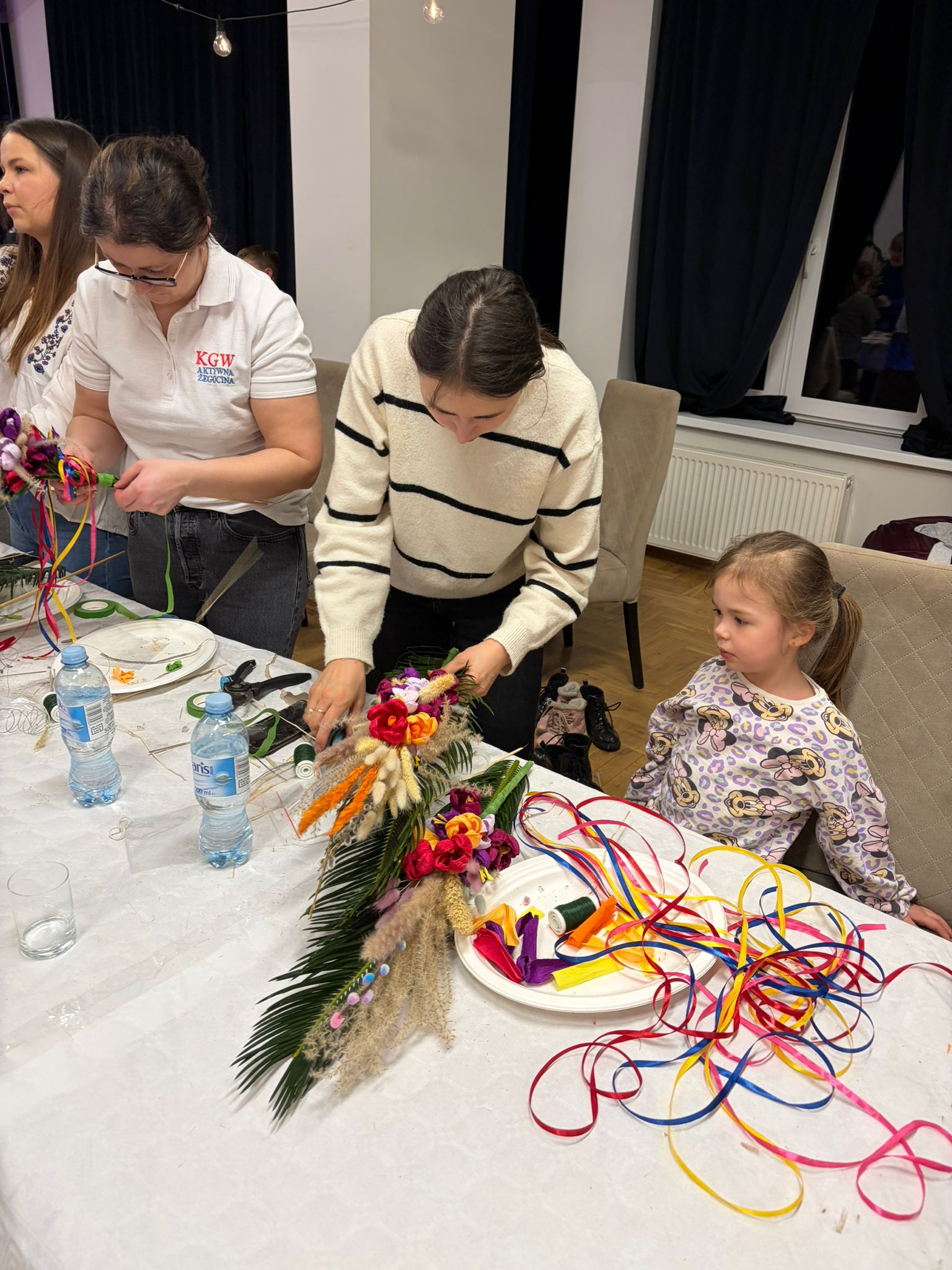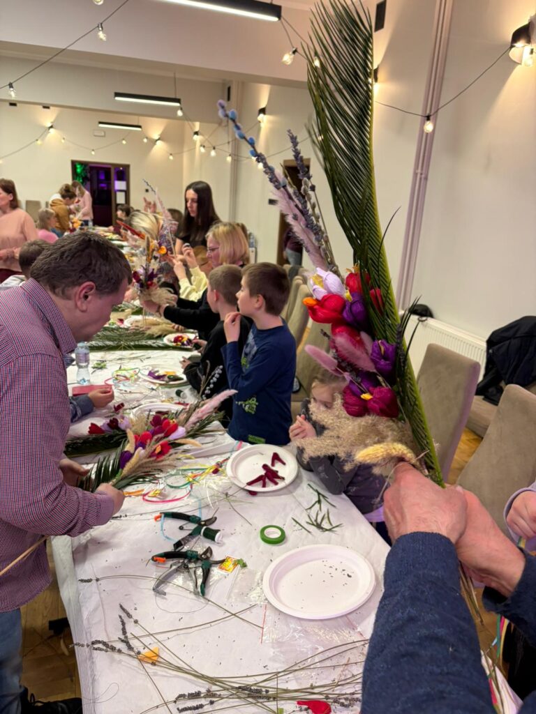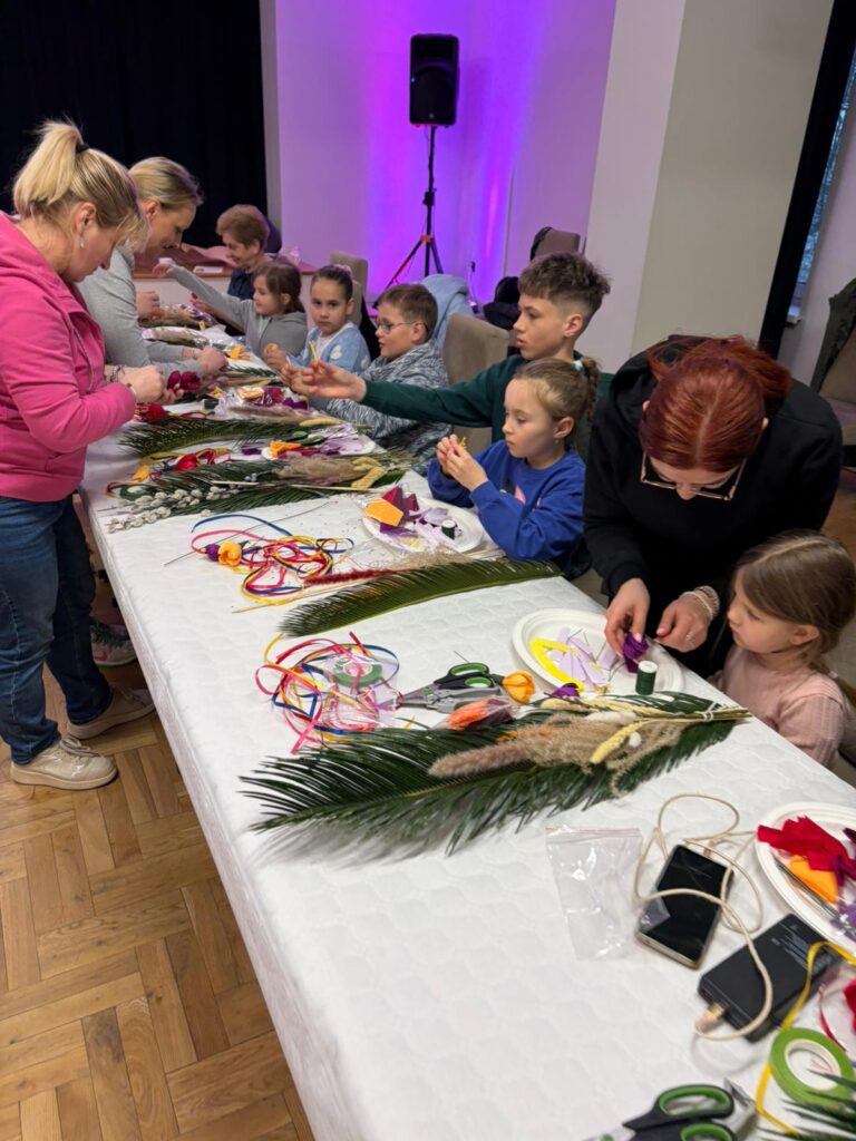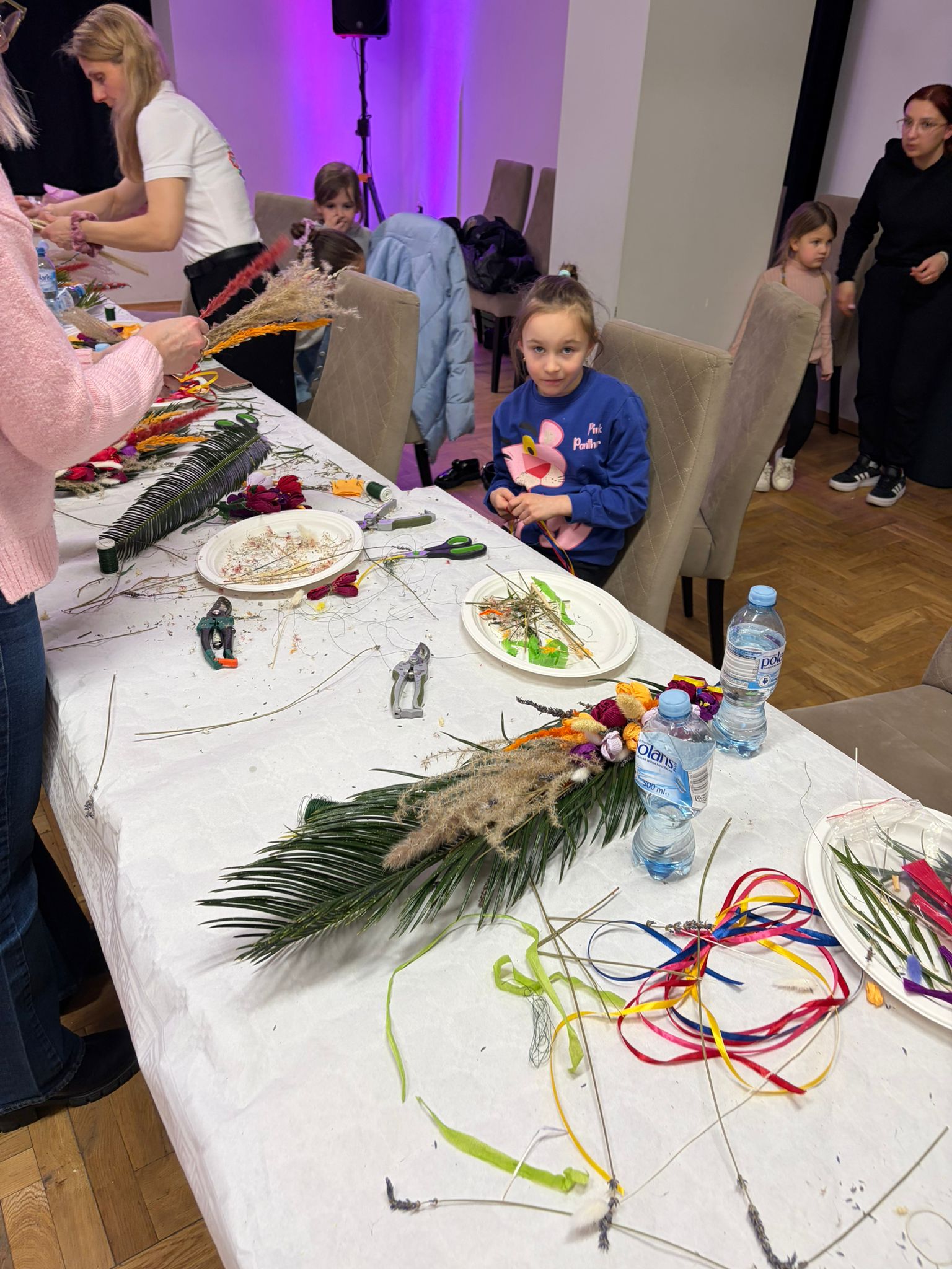 W zajęciach uczestniczyły dzieci wraz z opiekunami z terenu gminy, którzy z entuzjazmem włączyli się w twórcze działania. Dzięki wsparciu instruktorów z Pracowni Florystycznej MP Magdalena Płoskonka uczestnicy mieli okazję poznać różnorodne techniki tworzenia palm oraz samodzielnie wykonać barwne kompozycje z wykorzystaniem tradycyjnych i dekoracyjnych materiałów.