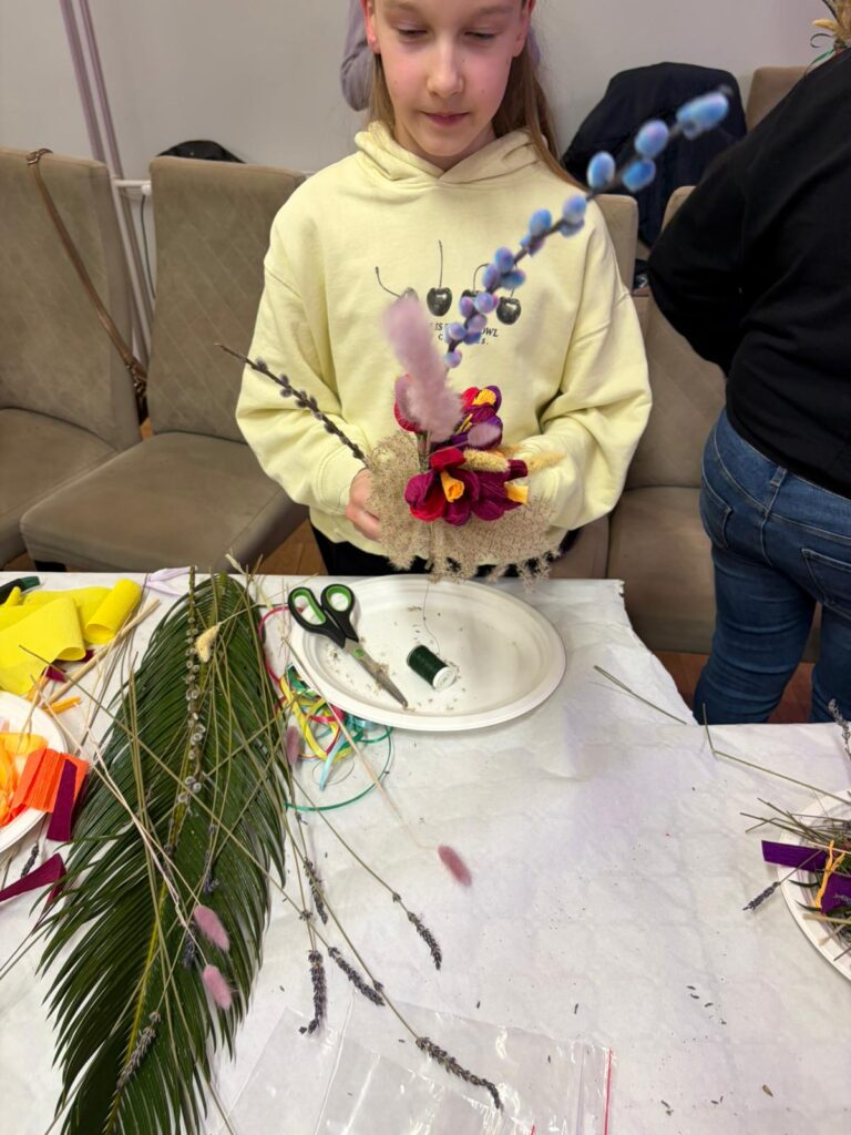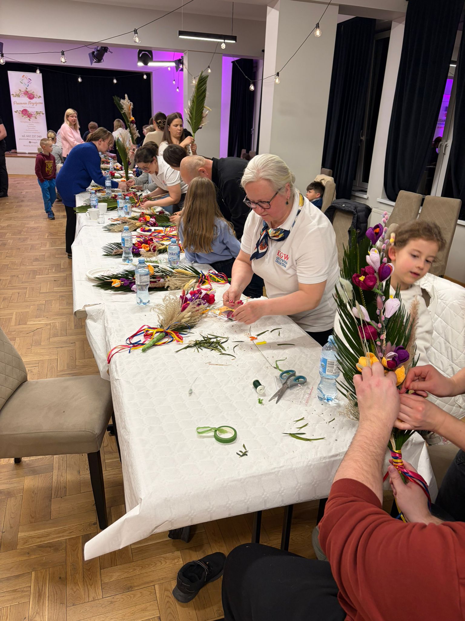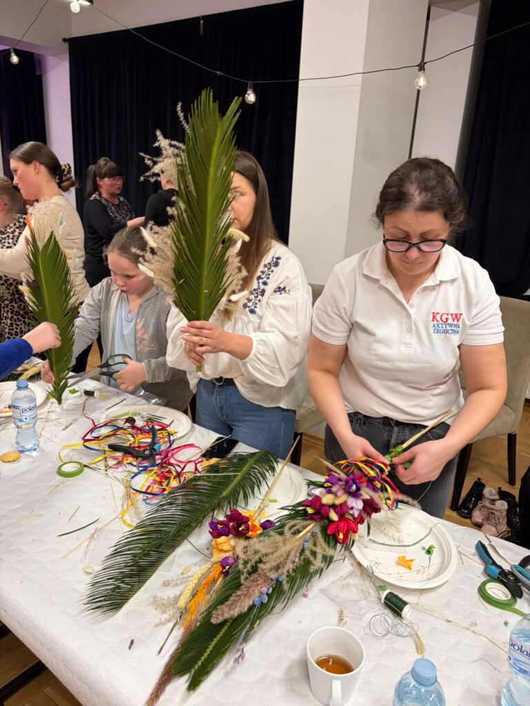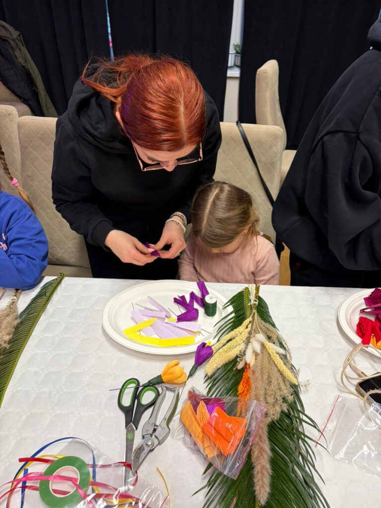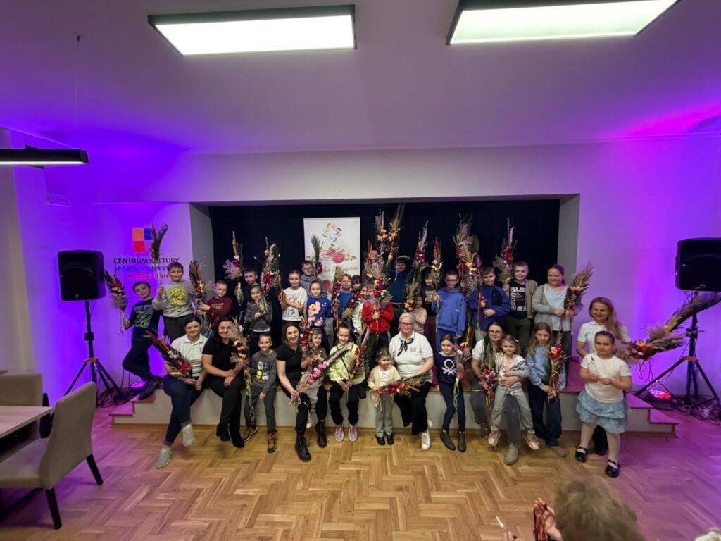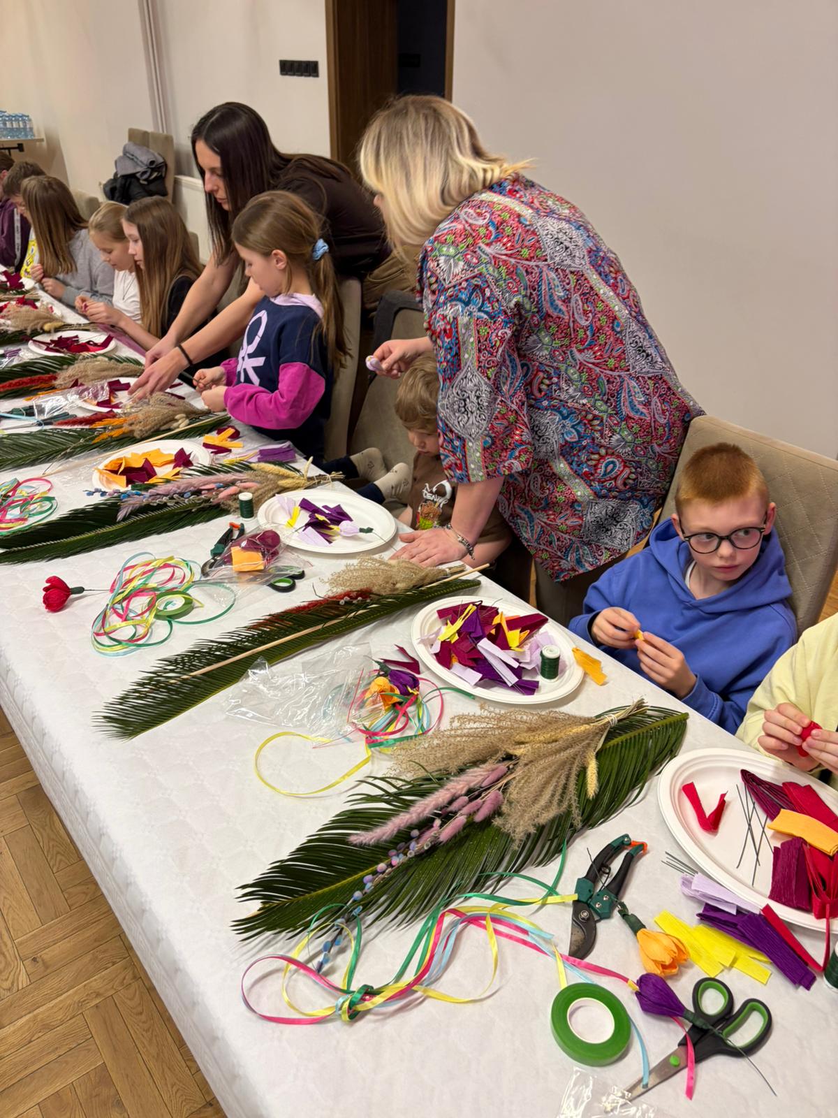 W zajęciach uczestniczyły dzieci wraz z opiekunami z terenu gminy, którzy z entuzjazmem włączyli się w twórcze działania. Dzięki wsparciu instruktorów z Pracowni Florystycznej MP Magdalena Płoskonka uczestnicy mieli okazję poznać różnorodne techniki tworzenia palm oraz samodzielnie wykonać barwne kompozycje z wykorzystaniem tradycyjnych i dekoracyjnych materiałów.