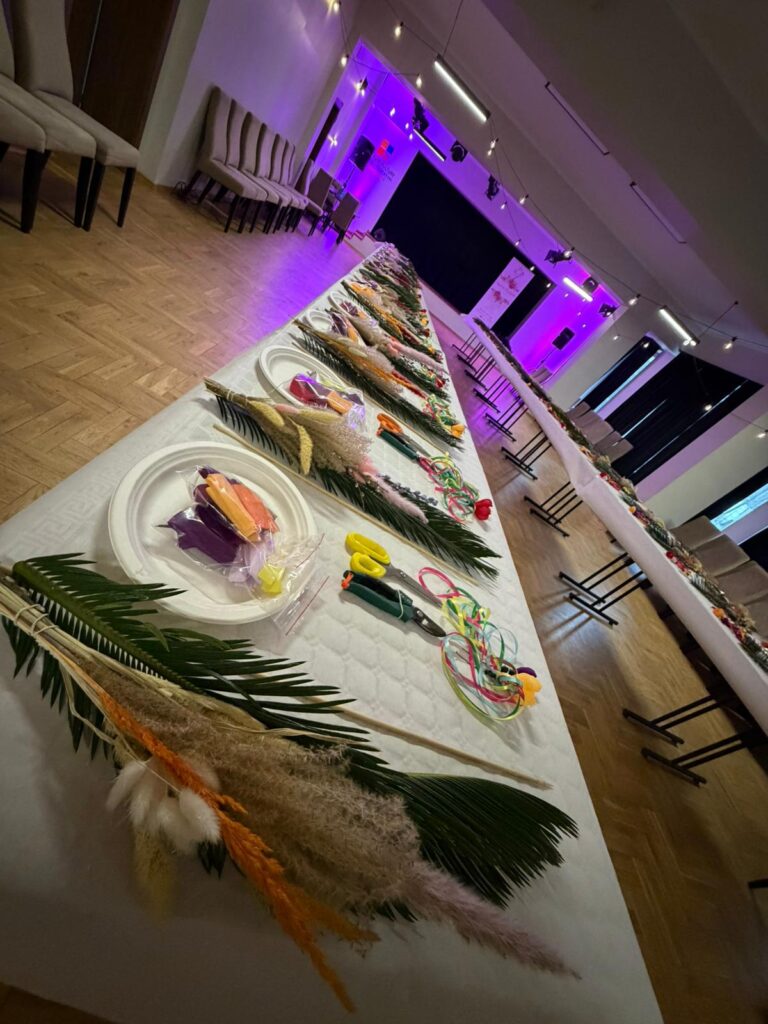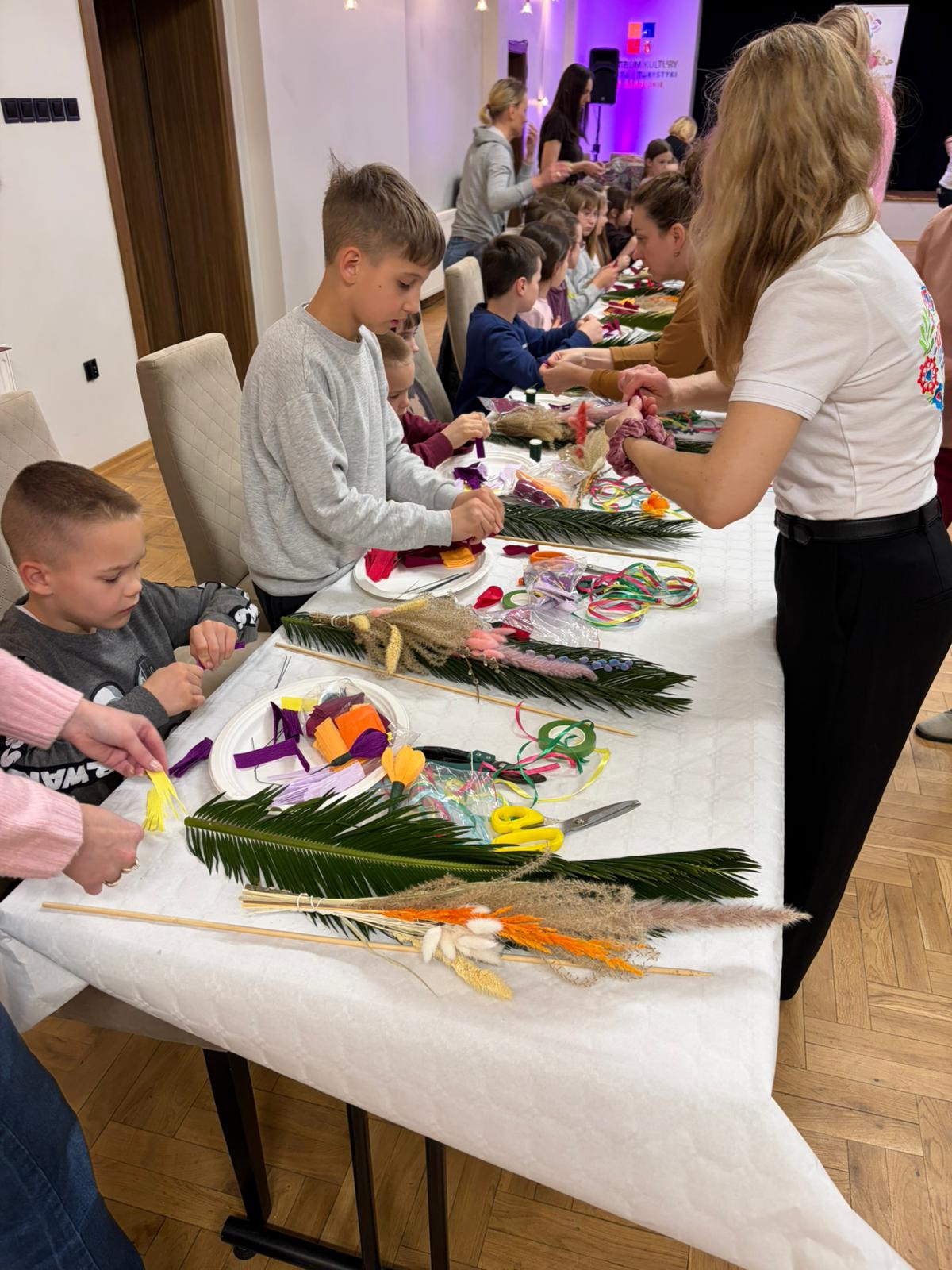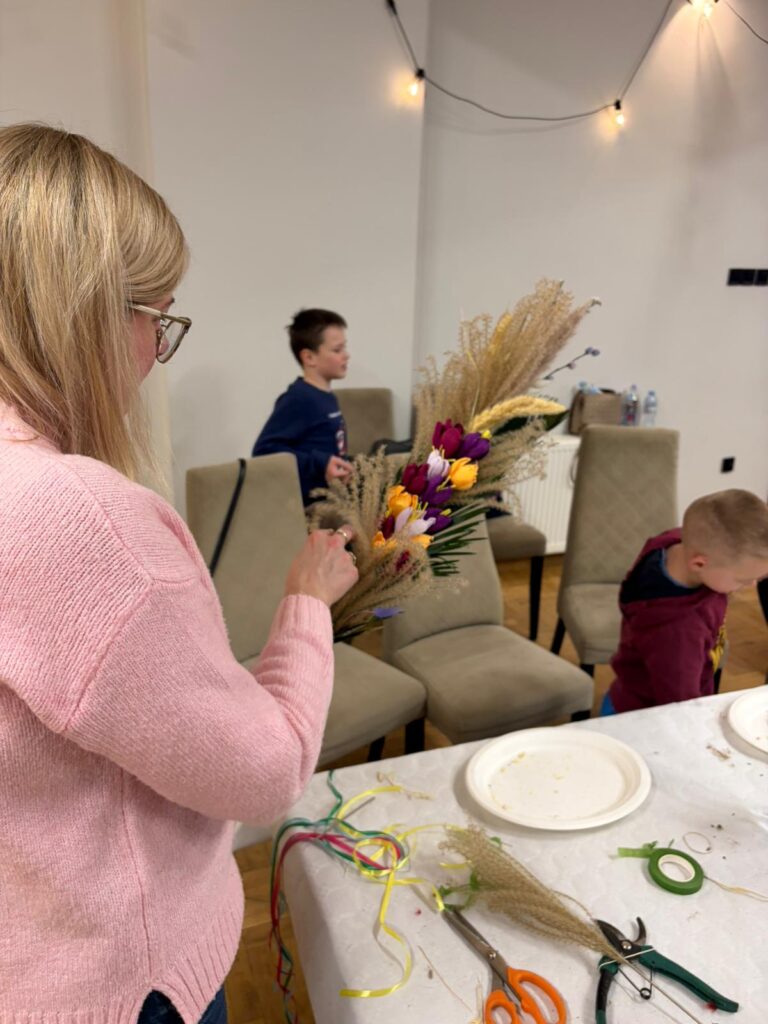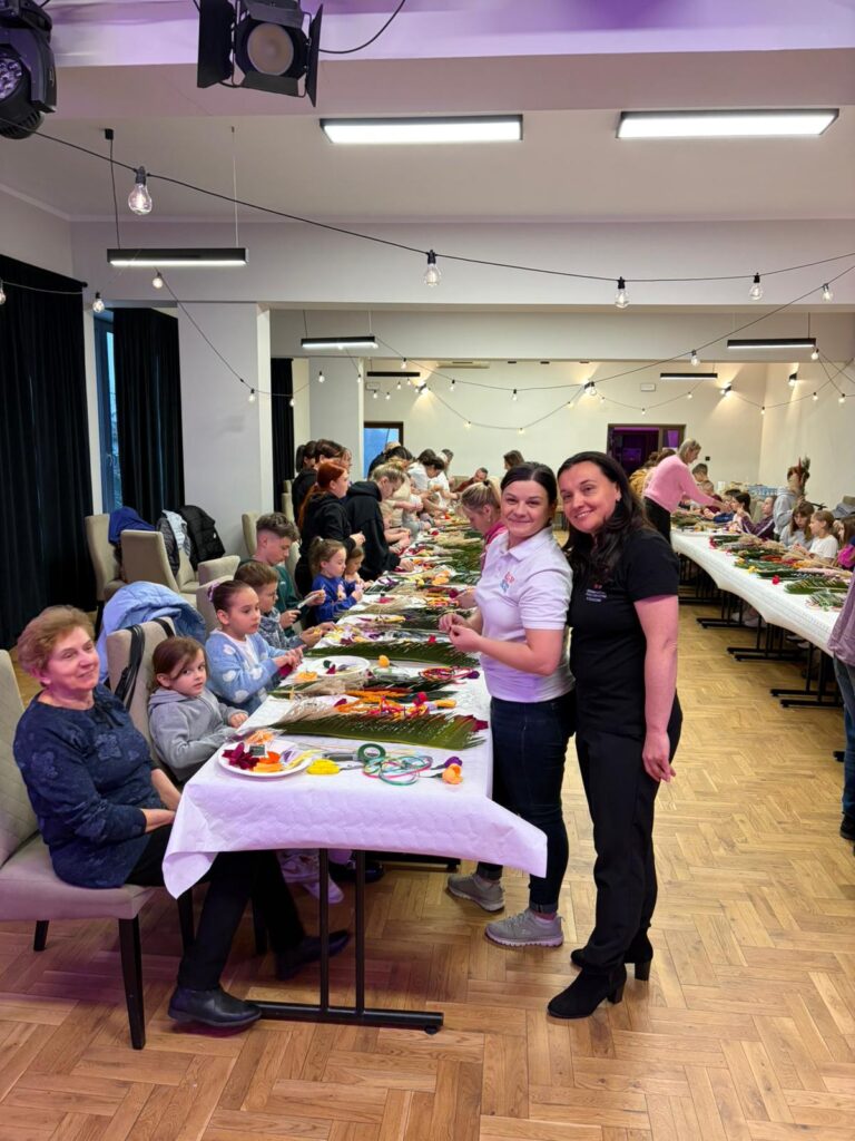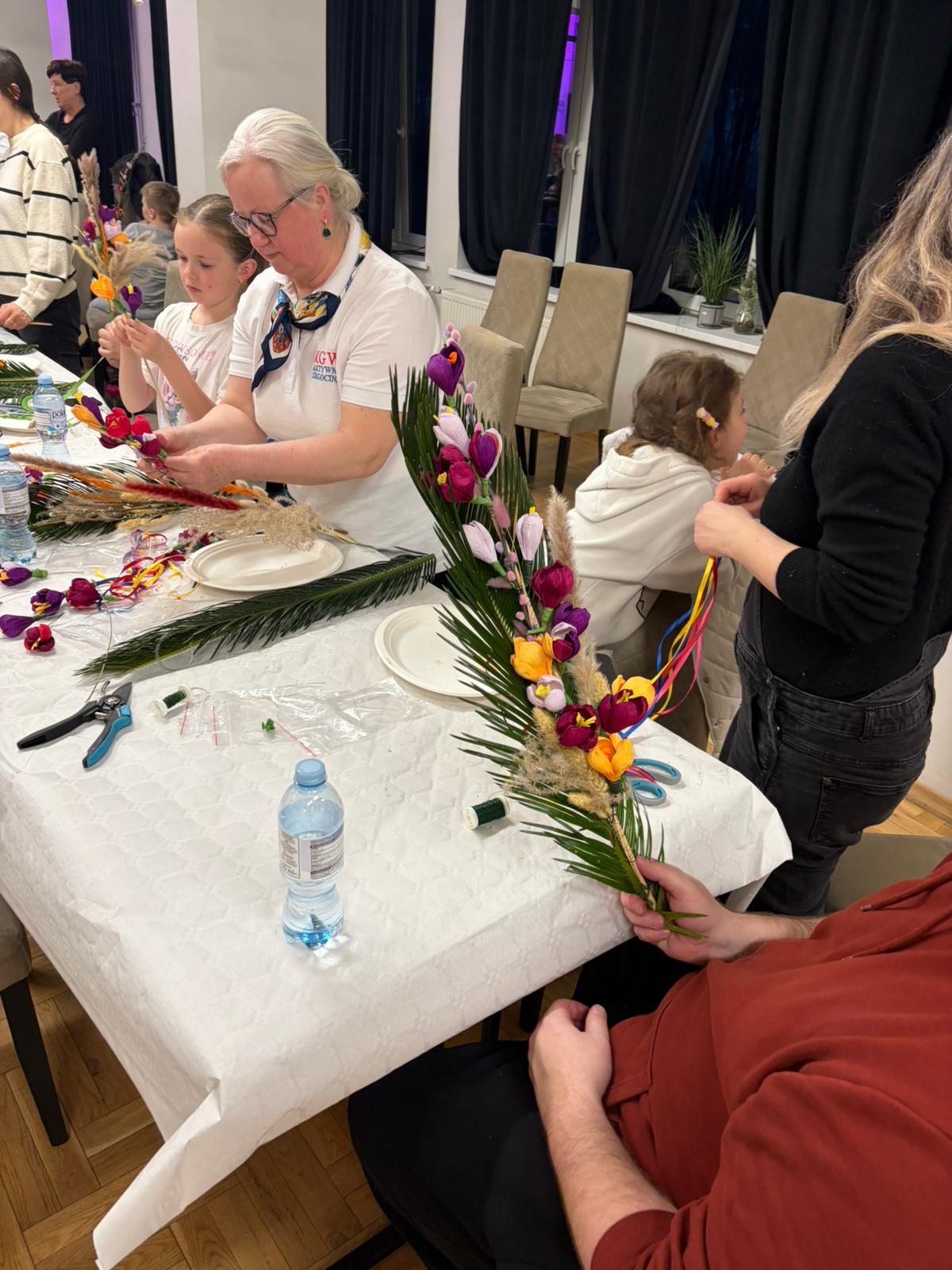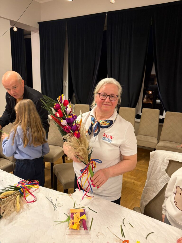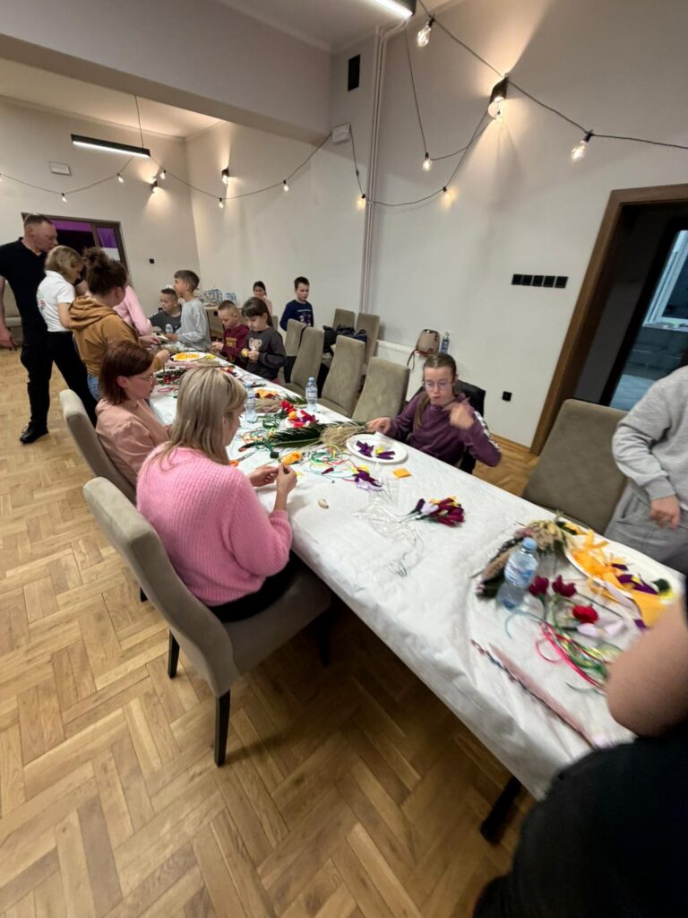W zajęciach uczestniczyły dzieci wraz z opiekunami z terenu gminy, którzy z entuzjazmem włączyli się w twórcze działania. Dzięki wsparciu instruktorów z Pracowni Florystycznej MP Magdalena Płoskonka uczestnicy mieli okazję poznać różnorodne techniki tworzenia palm oraz samodzielnie wykonać barwne kompozycje z wykorzystaniem tradycyjnych i dekoracyjnych materiałów.